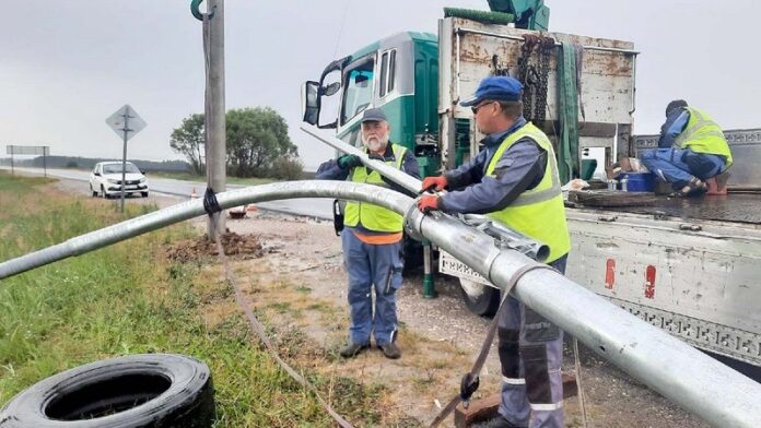 Профессионалы Андрей Фомичёв, Дмитрий Панин, Сергей Лисин и Сергей Петров во главе с Сергеем Саранчиным времени не теряют: переждали полуденный ливень – и снова за работу. И уже радуют глаз две г-образные опоры и пять столбов у поворота.