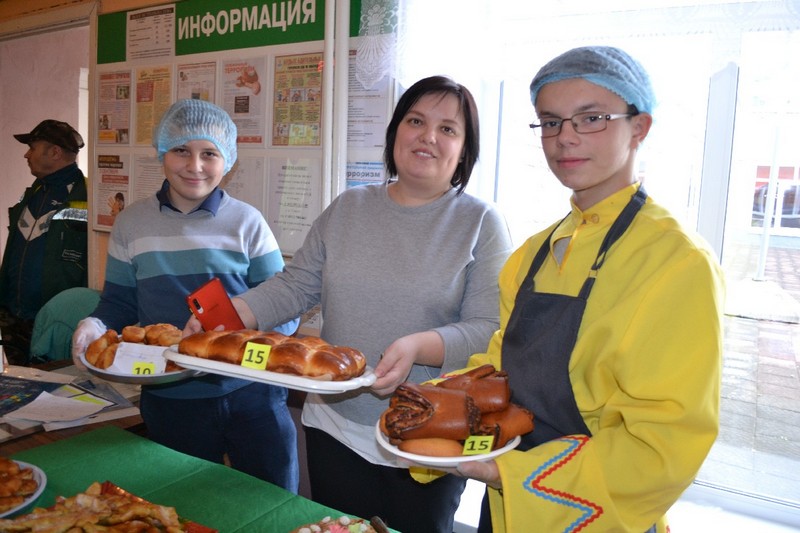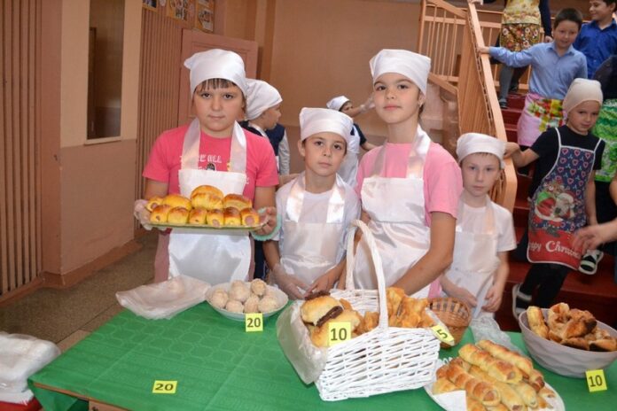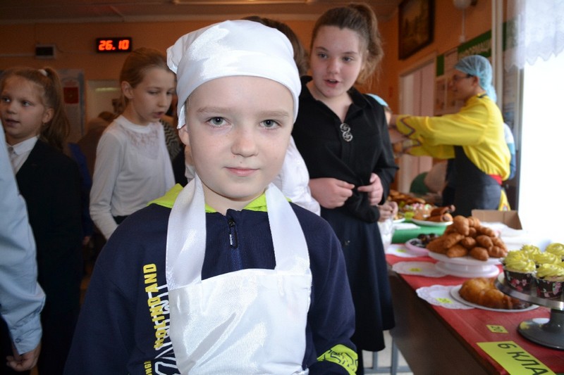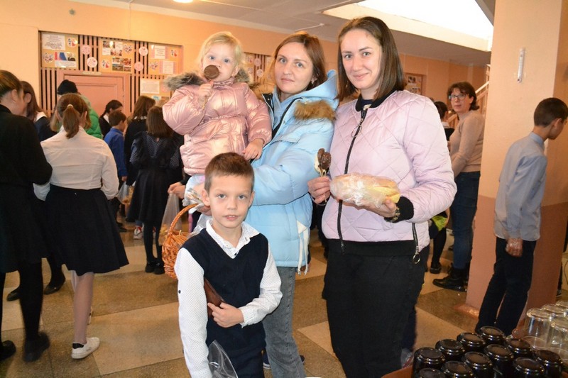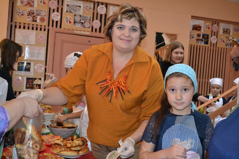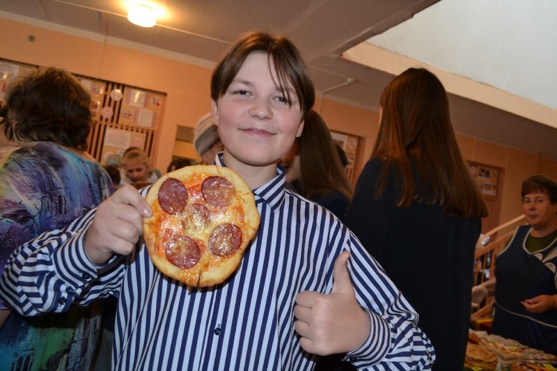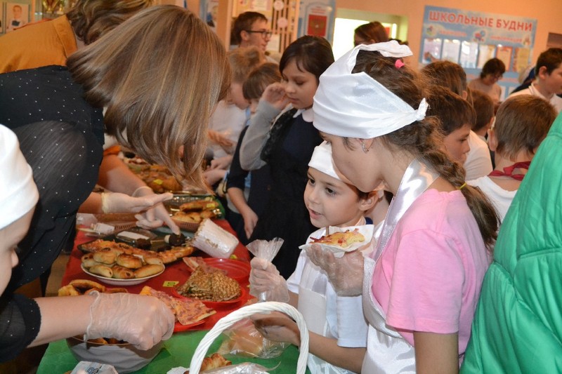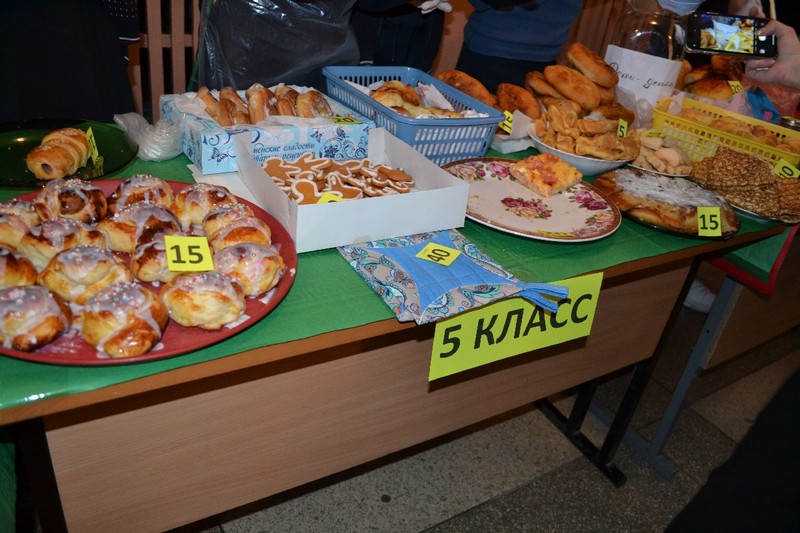 В ярмарке участие принимали ученики с первого по девятый классы. Накануне родители вместе с детьми пекли пиццы, пироги, пирожные, блины, делали конфеты на палочках, кто-то принес груши, а школа приготовила горячий чай.