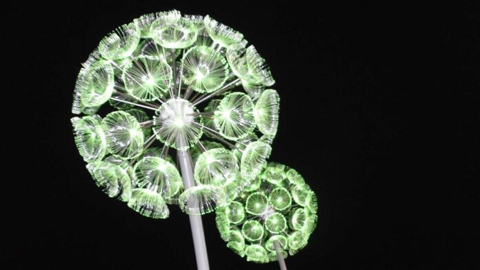 Особо выделяется площадка с гигантскими одуванчиками в глубине парка. Они меняют свой цвет: только что одуванчик был белым, а через несколько секунд уже фиолетовый, синий, красный, зеленый…