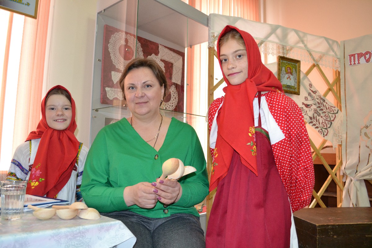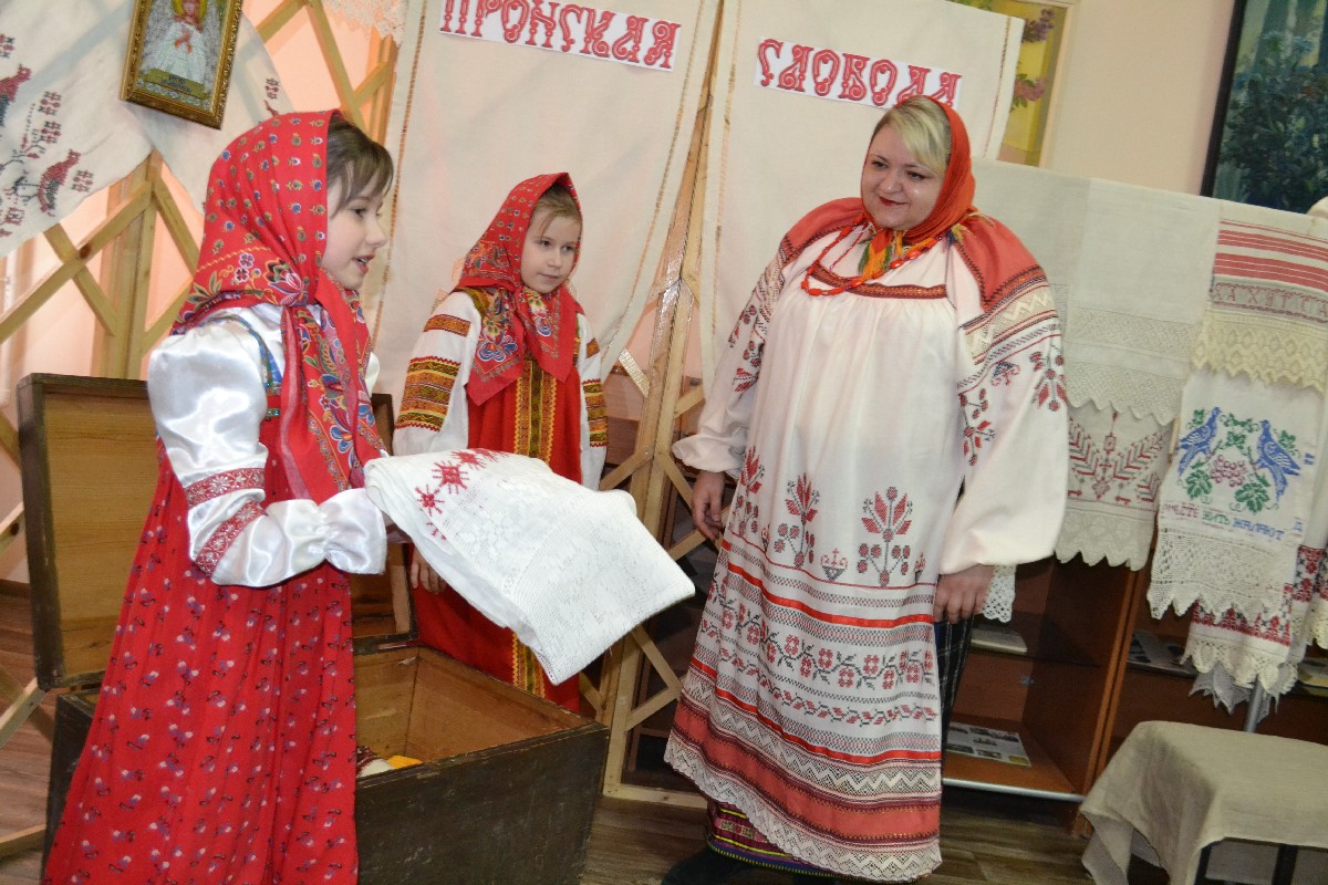 «Наша новая этнографическая площадка «Пронская слобода» представлена вышитыми рушниками, деревянными ложками, куклами-оберегами, которых хранятся в старинном сундуке», – говорит ведущая и сценарист театрализованной программы Анастасия Гусева, исполнившая роль матери двух дочек. Их сыграли школьницы. Она рассказала, какими ремеслами славилась Пронская земля, уделила внимание песням, народным костюмам, вышивке.