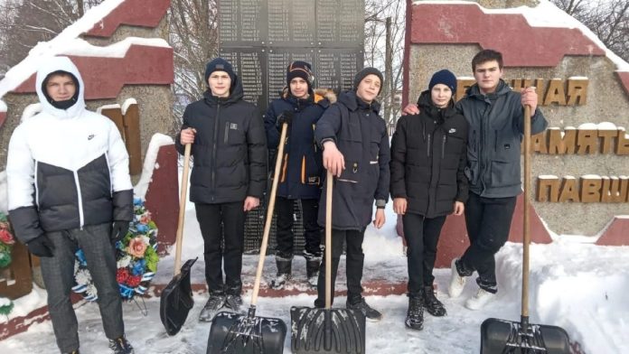 А юнармейцы под руководством учителя ОБЖ Александра Лопатина убрали снег на сельском памятнике: местные школьники шефствуют над ним уже несколько лет.