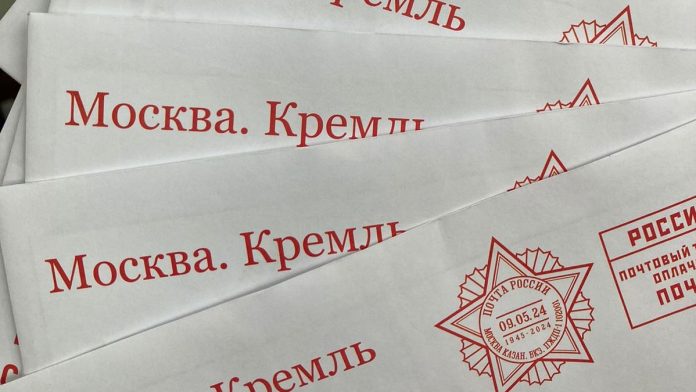 В почтовом отправлении находится именная открытка с поздравлением с 79-й годовщиной Победы в Великой Отечественной войне, подписанным Президентом России.